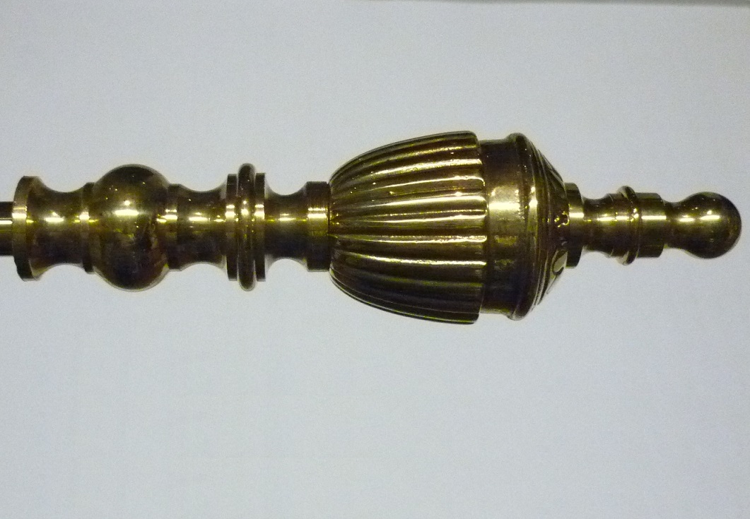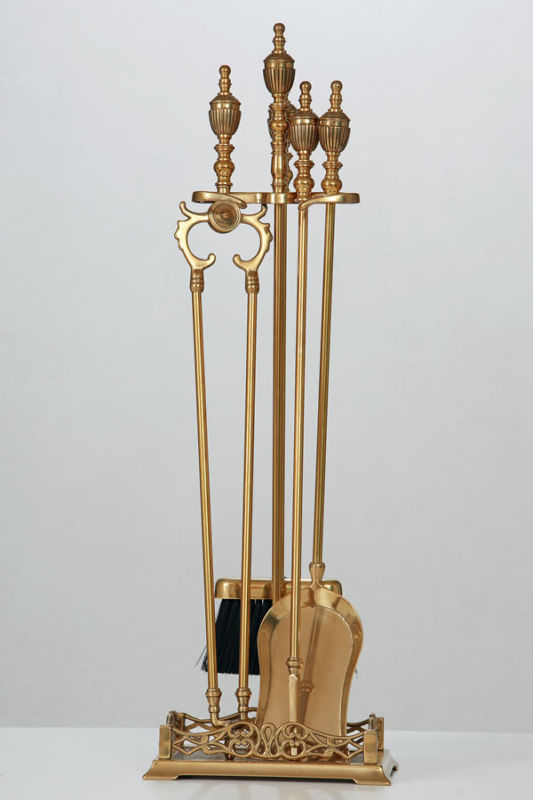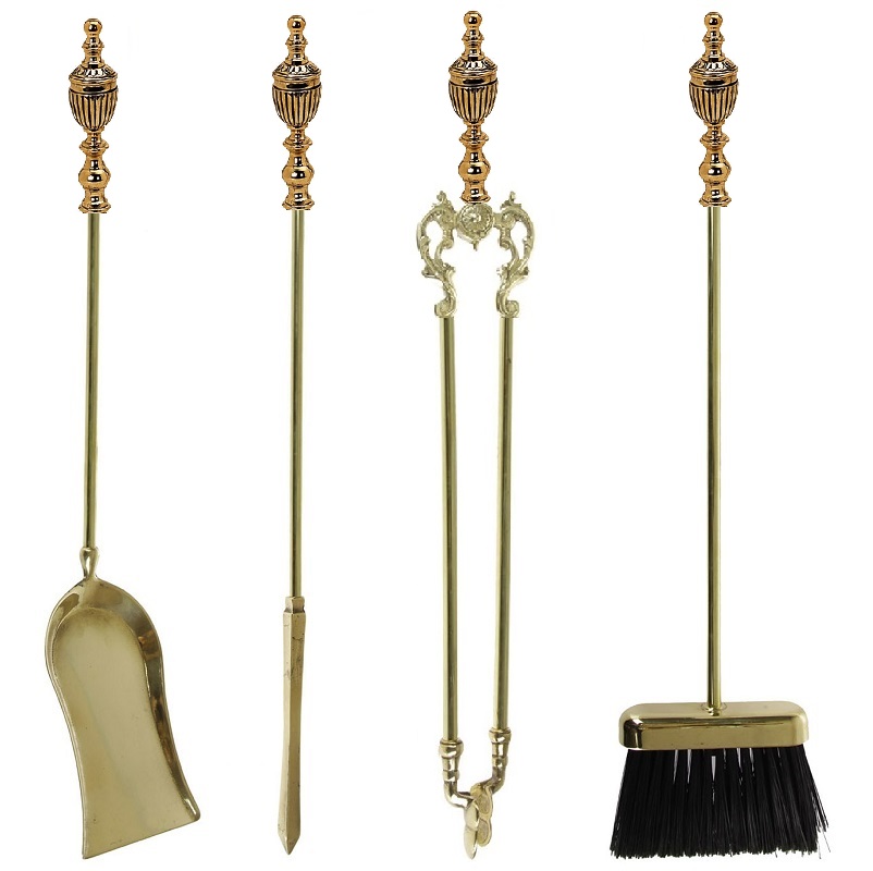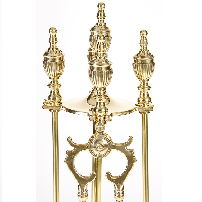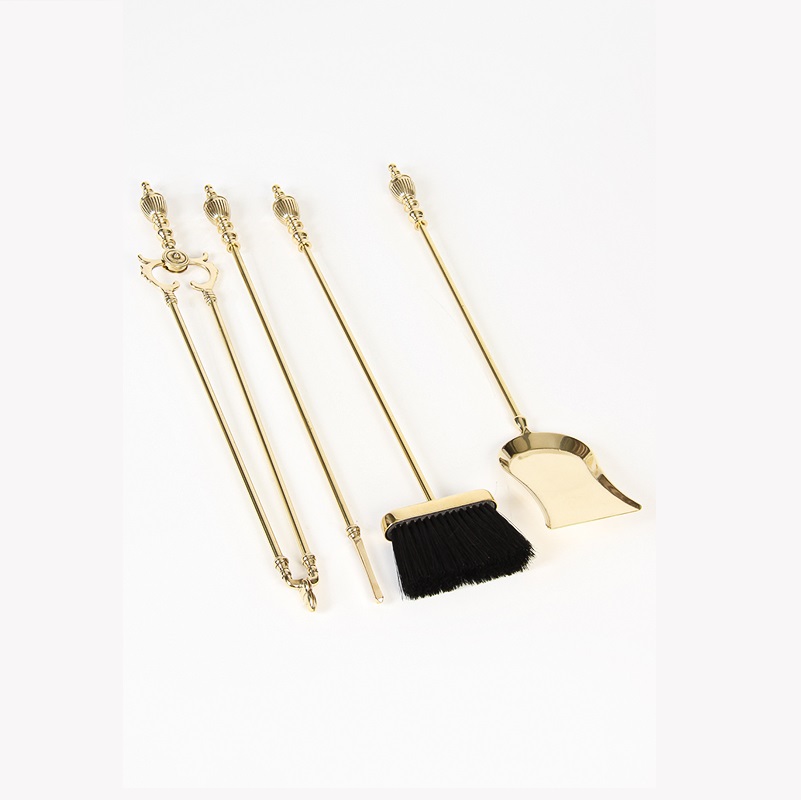 Set di attrezzi da camino in Massiccio ottone con finitura lucida, composto da 4 accessori ed il trespolo, la cui base funge da vaschetta raccogli cenere, importante impugnatura stile impero il cui stampo ha oltre 200 anni di storia ed oggi presente nei migliori salotti del mondo.