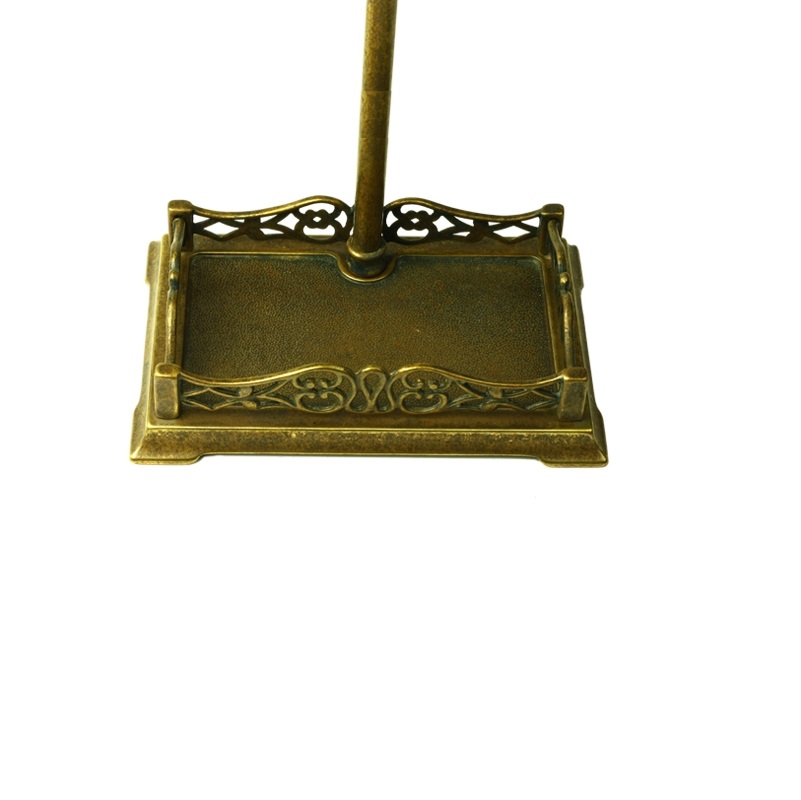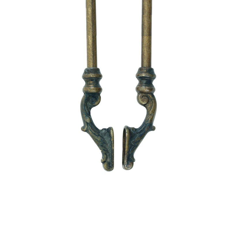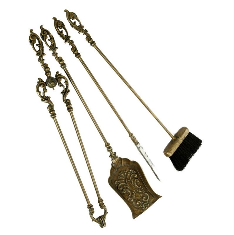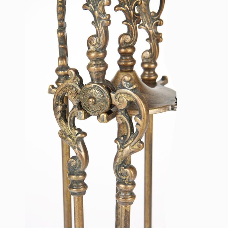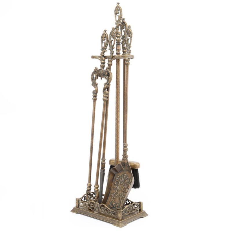 Set di attrezzi da camino in Massiccio ottone nella finitura Anticato, composto da 4 accessori e sono, Paletta, Scopino, Pinza ed Attizzatoio, il trespolo che con la sua base di forma rettangolare funge da vaschetta raccogli cenere e ne garantisce un’ottima stabilità