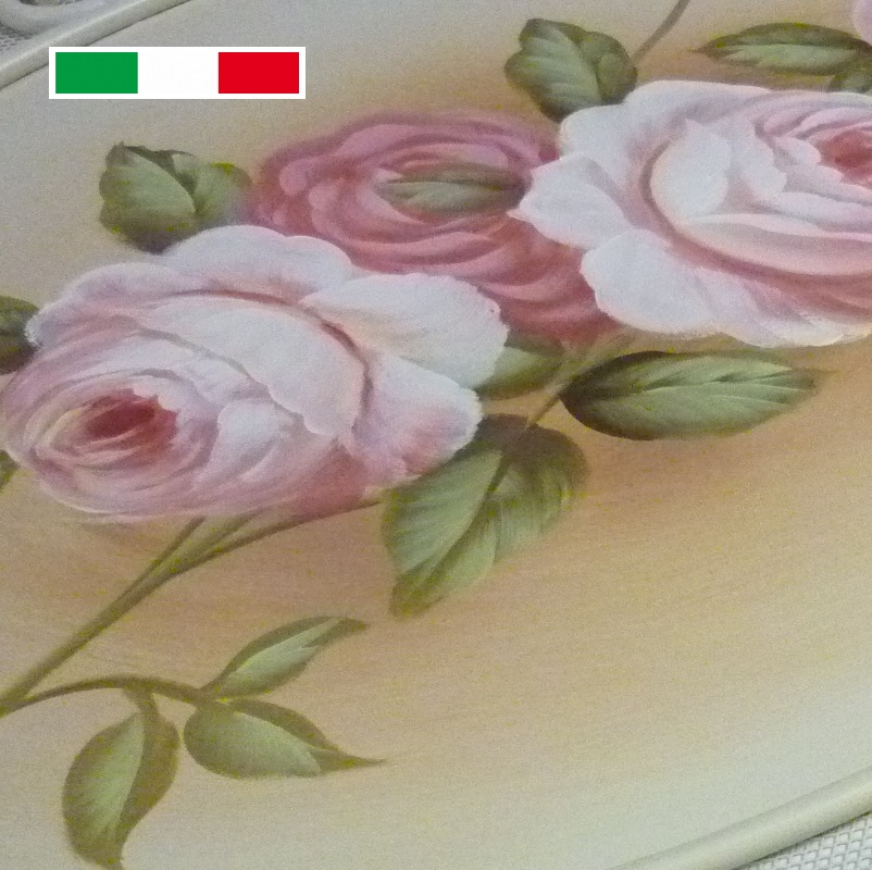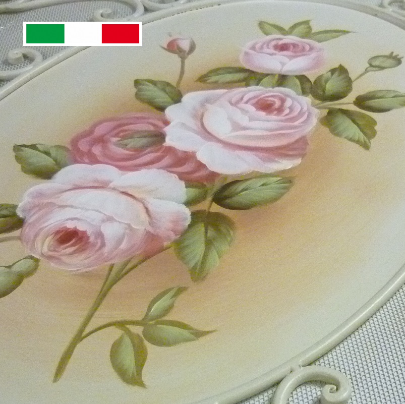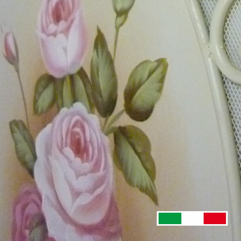 Copricamino o parascintille monopezzo in ferro battuto e forgiato a mano proprio come si faceva nei tempi passati, colore avorio decorato a mano con soggetto floreale.