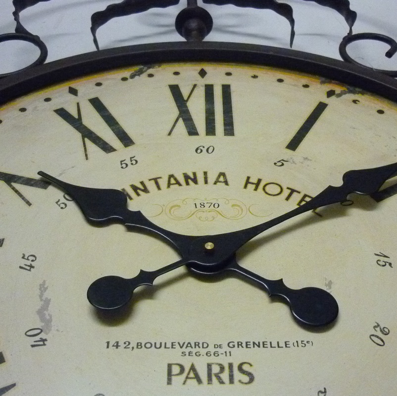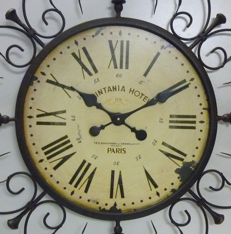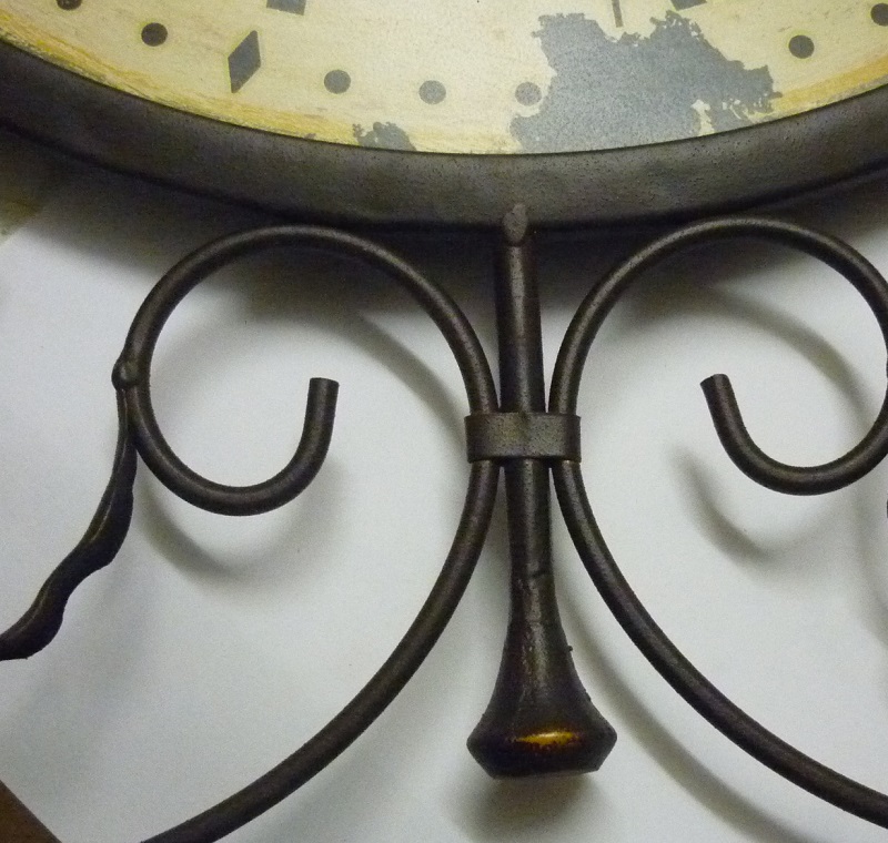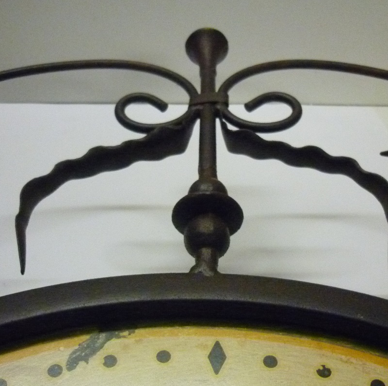 Orologio da parete o Sopra Camino di forma circolare di grande taglia con cornice in ferro battuto, senza vetro e numeri romani.