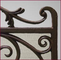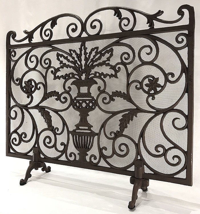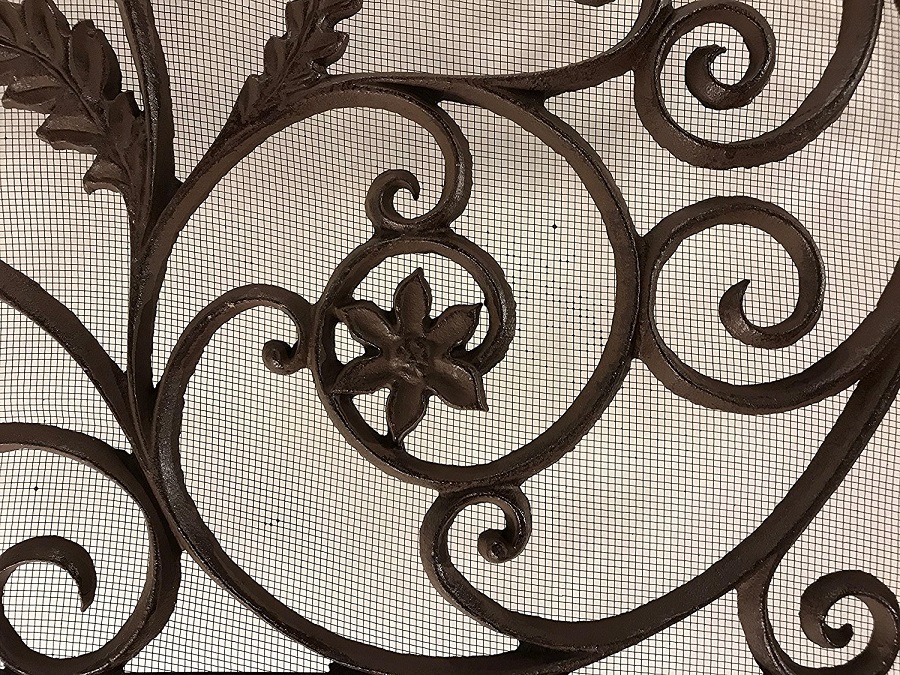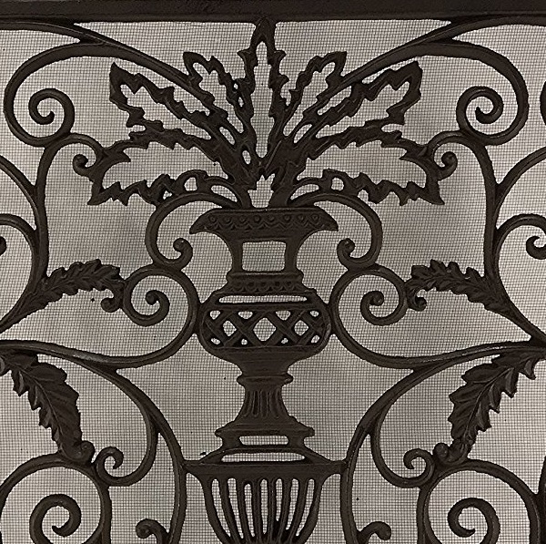 Parascintille in Ghisa a pannello con soggetto floreale e rete protettiva.