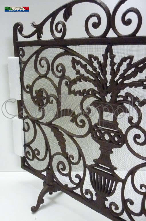 Parascintille in ghisa a pannello monocorpo, con soggetto floreale e rete protettiva.