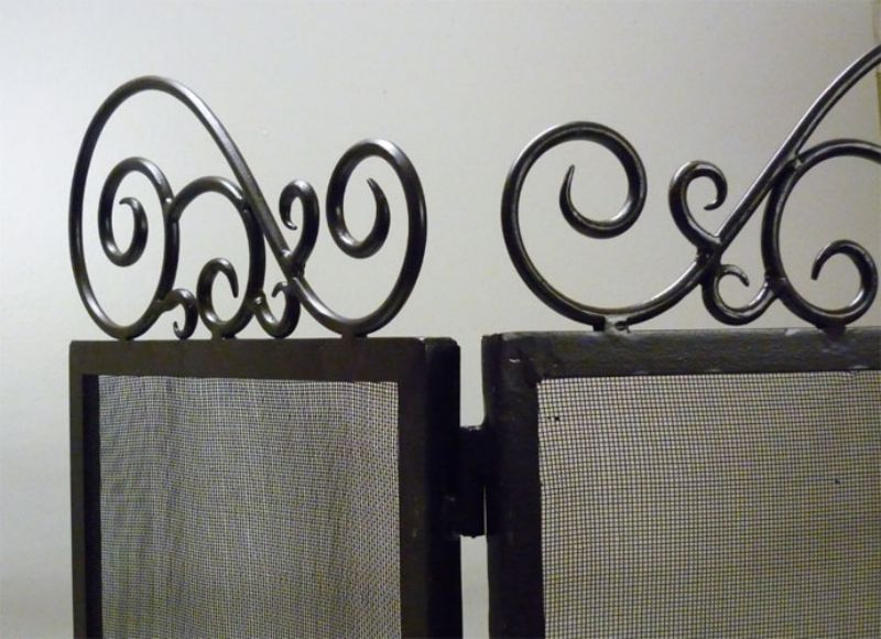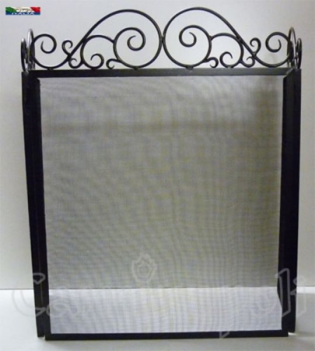 Pannello parascintille in ferro forgiato, ogni riccio originale a se stesso, grandi finestre per chi ama vedere il fuoco in modo diretto ma deve rassicurare il salone che ospita il camino.