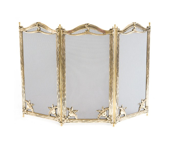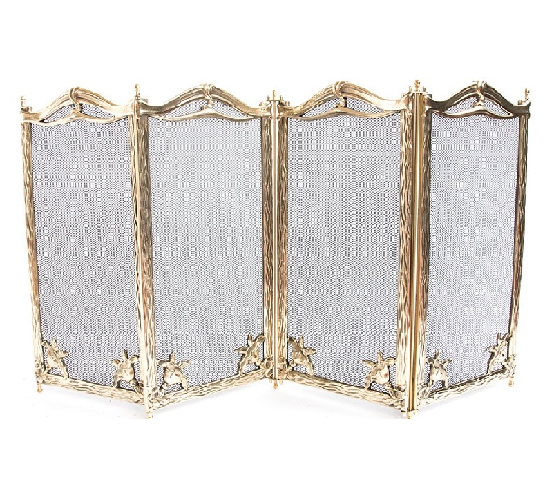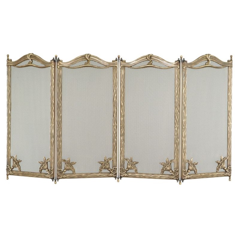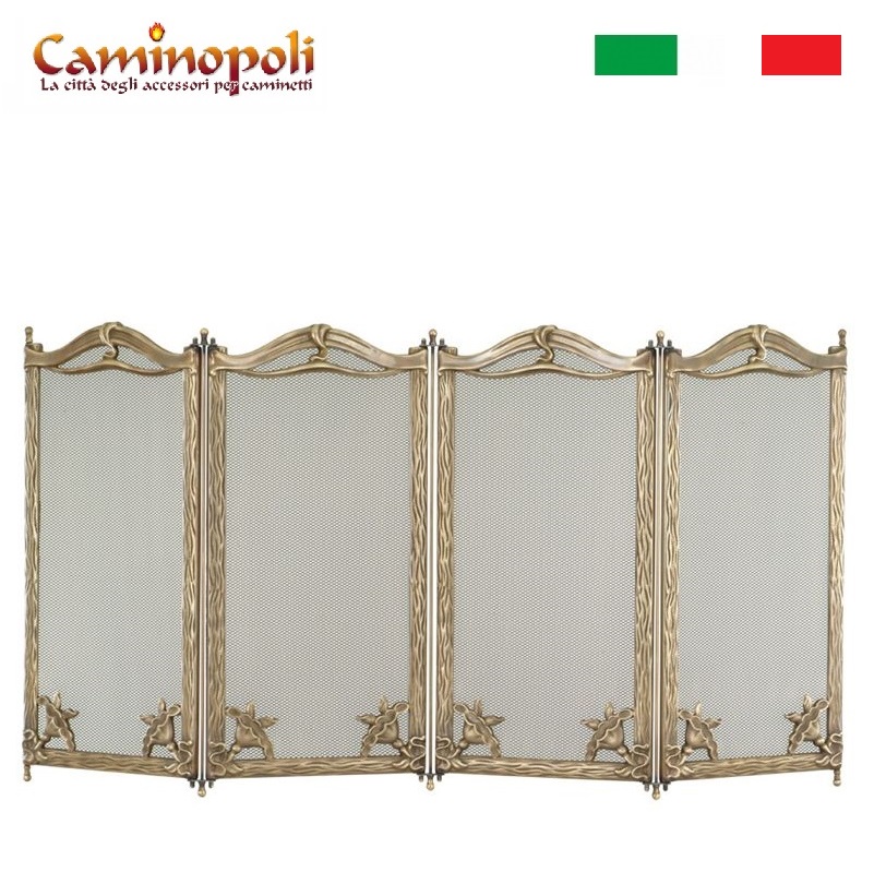 Parascintille da camino interamente in ottone, composto con 3 e 4 ante uguali, larghe ognuna 25 cm e realizzata in due stampi, cornice, rete e contro-cornice.