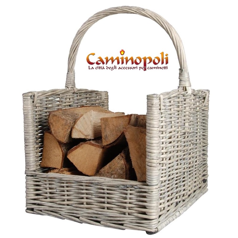Portalegna in vimini o rattan, aperto su due lati al fine di ospitare anche la legna di taglio irregolare, comoda come portariviste nel periodo estivo.