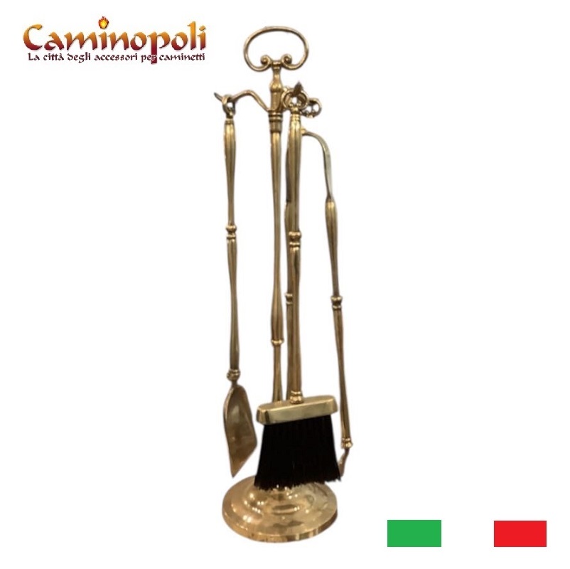 Trespolo porta attrezzi per il camino realizzato in ottone e composto da Paletta, Scopino e Pinza.