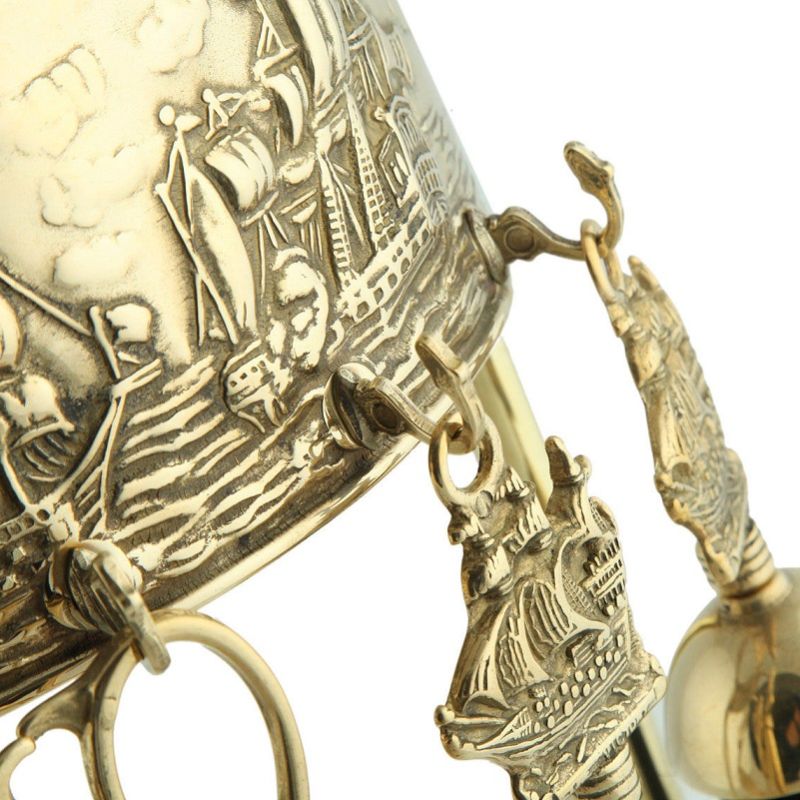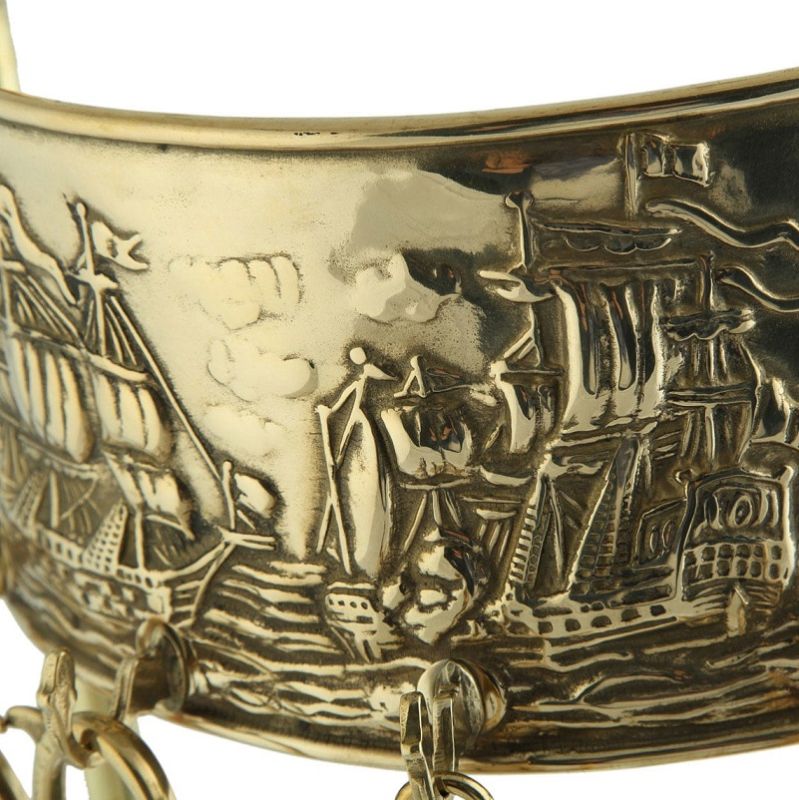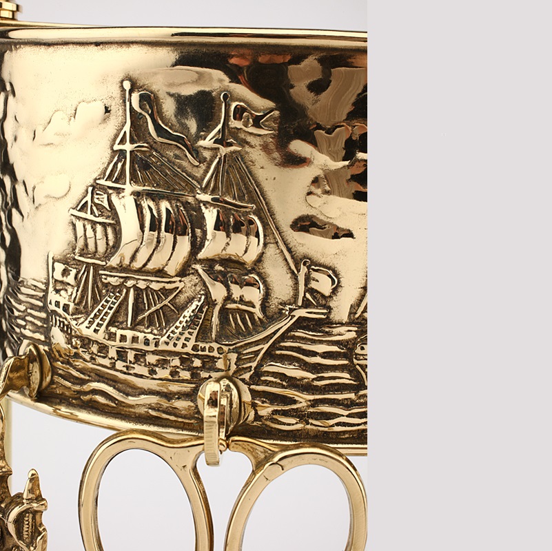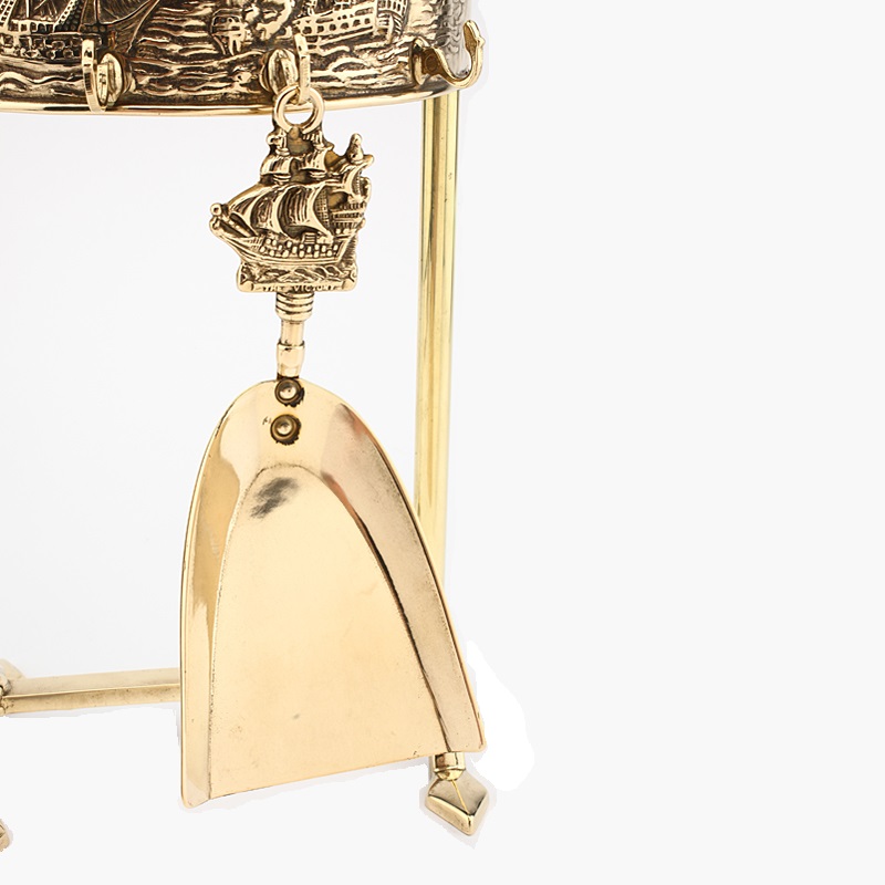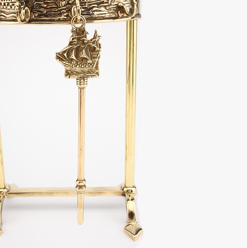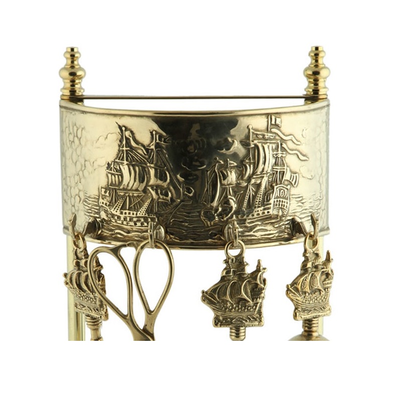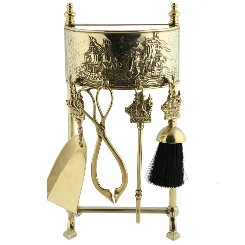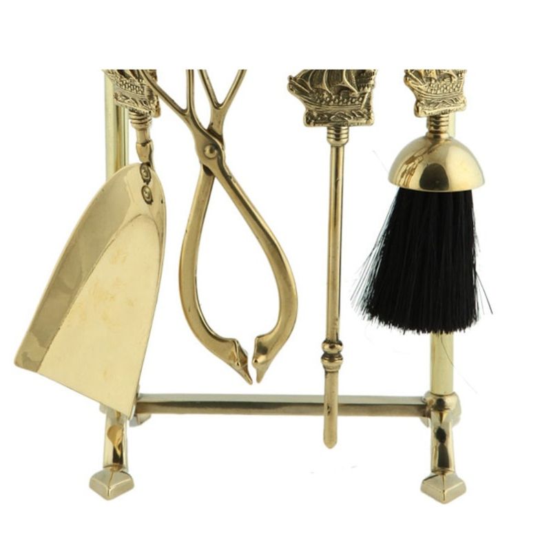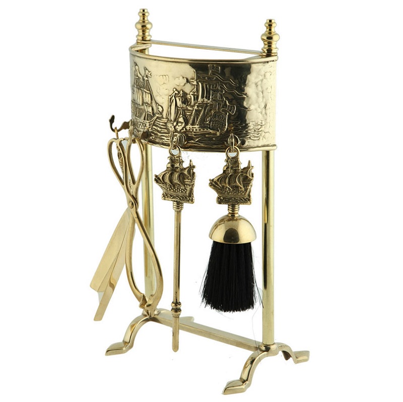 Set di attrezzi 4+1 realizzato completamente in ottone e composto da pinza, attizzatoio, paletta, scopino.