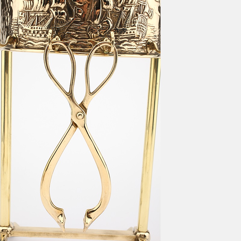 Set di attrezzi per il camino 4+1, completamente in ottone e composto da Pinza, Attizzatoio, Paletta, Scopino.