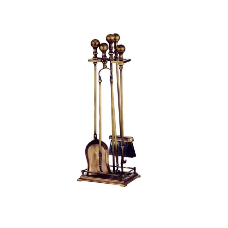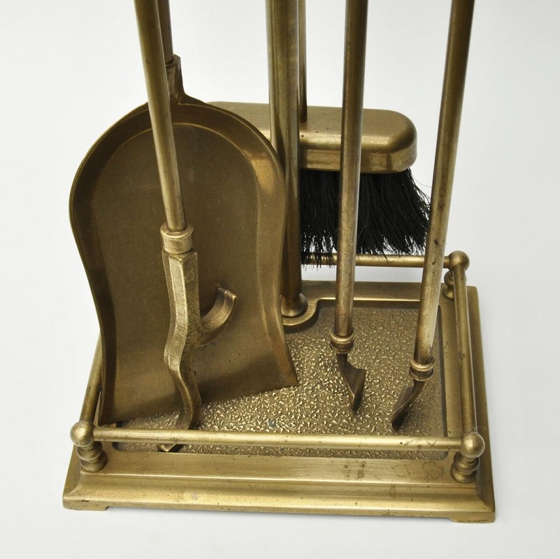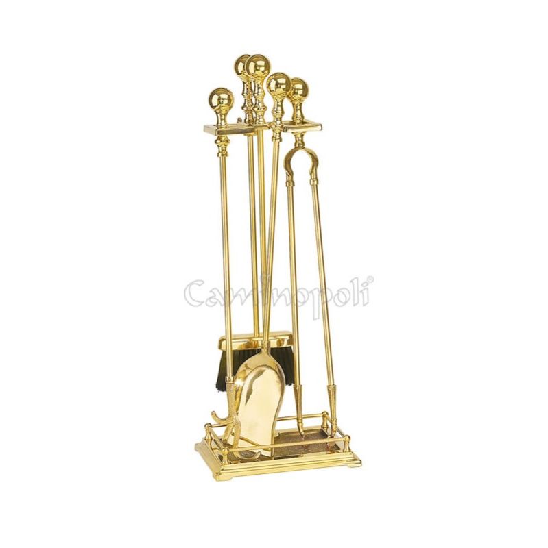 Set di attrezzi da camino 4+1, composto da scopino, paletta, attizzatoio e pinza, realizzato in ottone massiccio, la base rettangolare aiuta a tenere pulito contenendo le ceneri che potrebbero rimanere vicino ai singoli attrezzi dopo l’utilizzo.