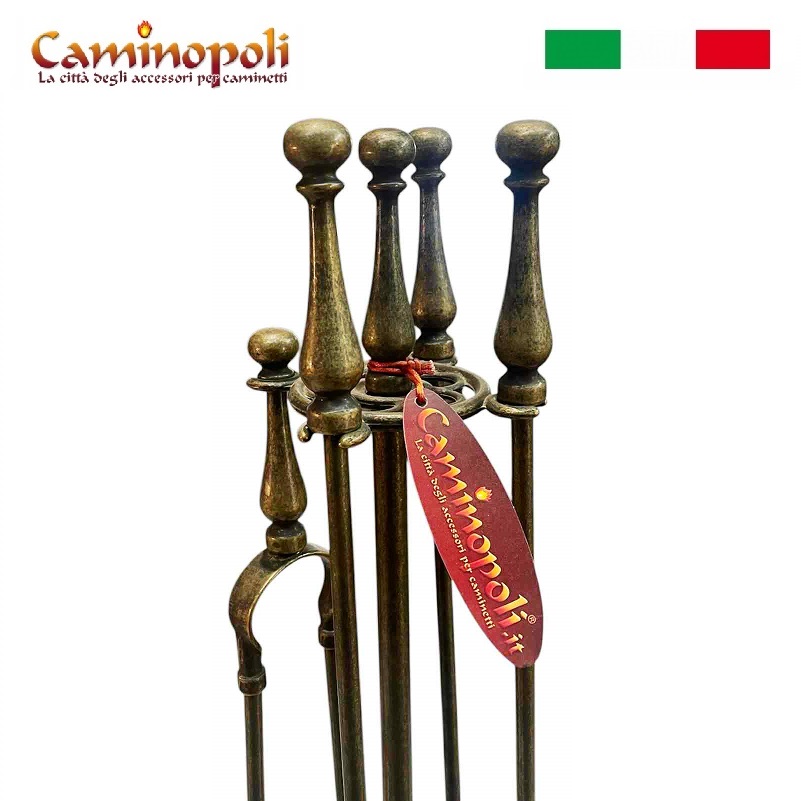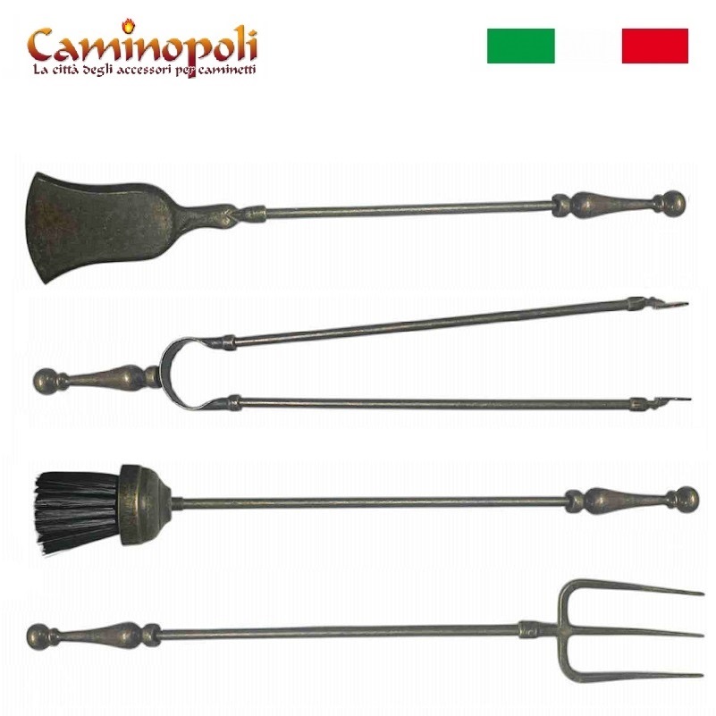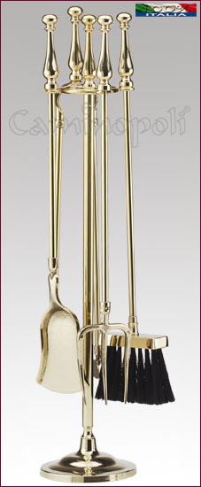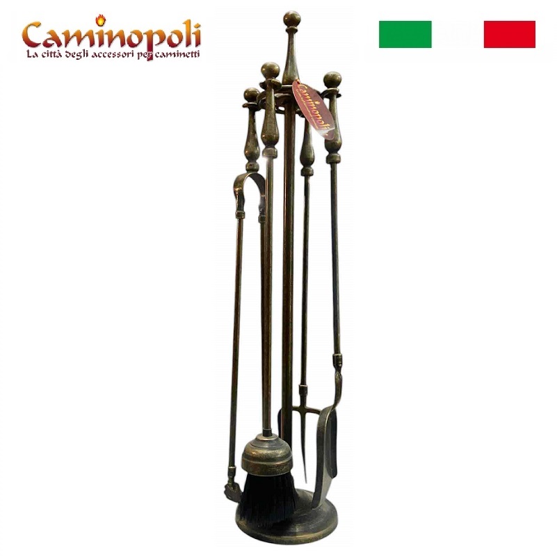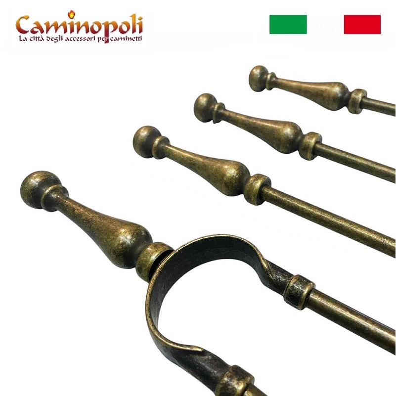 Questo trespolo con gli attrezzi per la gestione del camino è realizzato in ottone, proposto nella finitura lucida e antica, composto da quattro utensili, Paletta, Scopino, Pinza ed Attizzatoio.