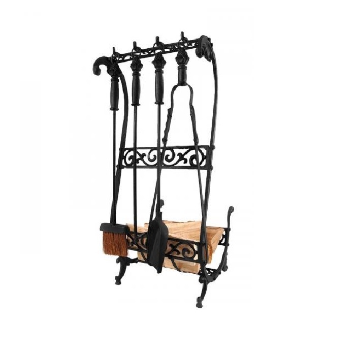 Set di attrezzi 4+1 pezzi in ghisa, con portalegna, colore nero