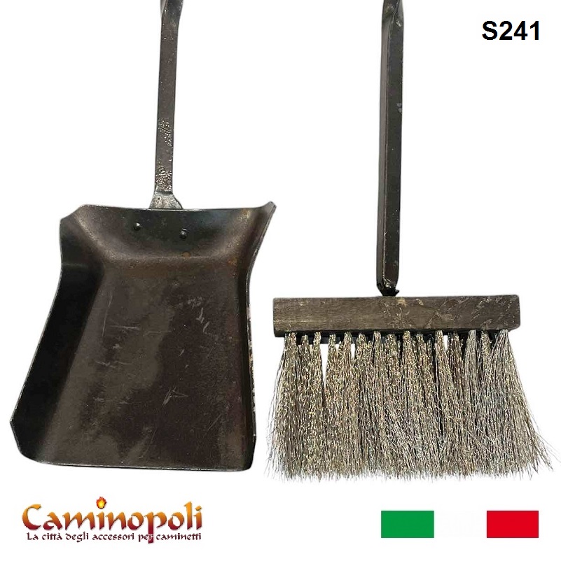 Fascia con 4 ganci per appendere gli utensili, Paletta, Scopino con setole in acciaio, Pinza a molla ed Attizzatoio.