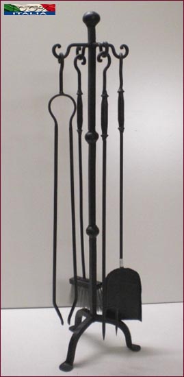 Set di attrezzi per il camino 4+1 realizzato in ferro forgiato e battuto interamente a mano da sapienti artigiani Salentini, pratico ed essenziale, composto da paletta, scopino, attizzatoio e pinza con setole in filo d’acciaio.