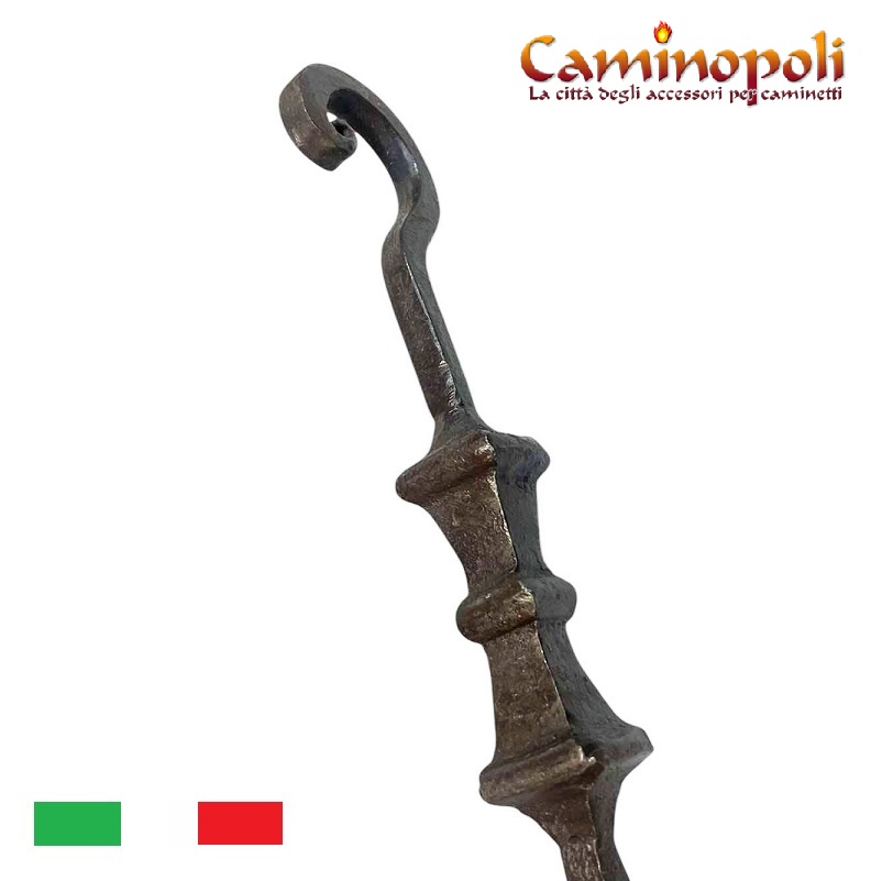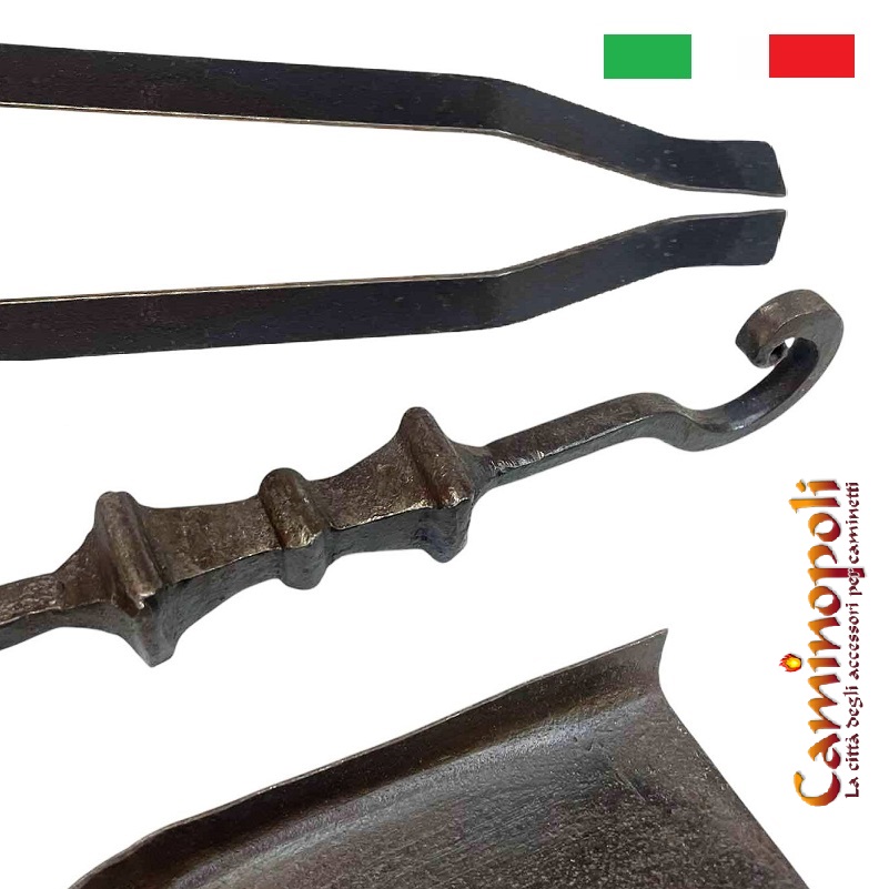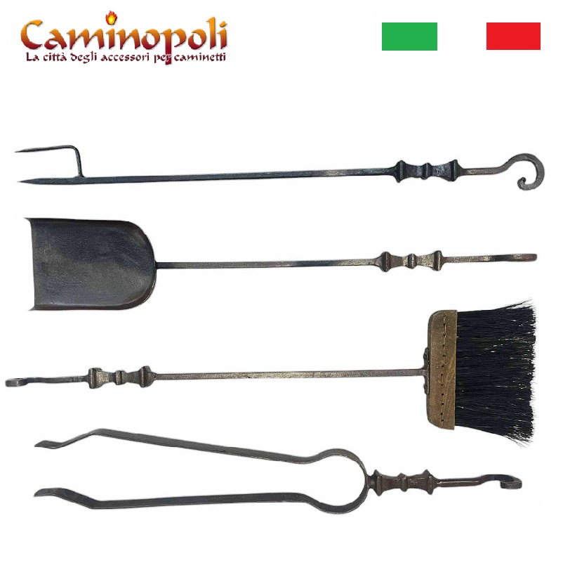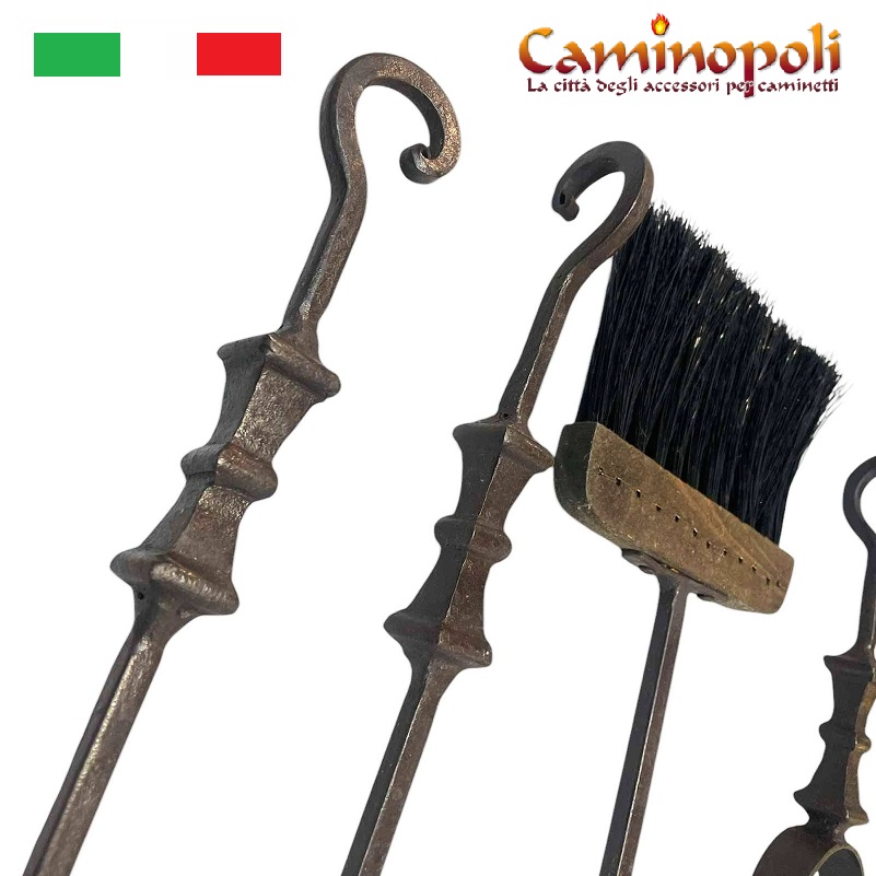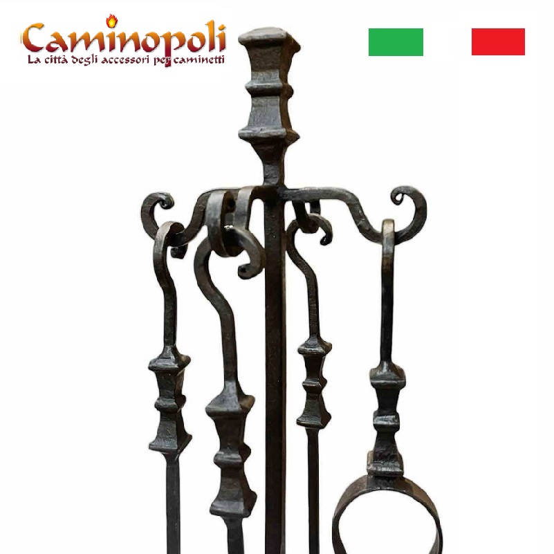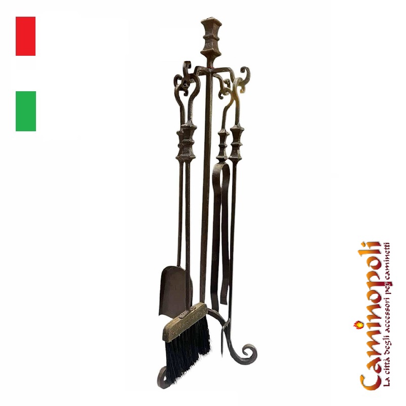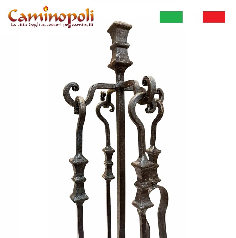 Trespolo porta-attrezzi per il camino, con quattro accessori, realizzato in ferro lavorato e forgiato interamente a mano, privo di qualunque processo industriale.