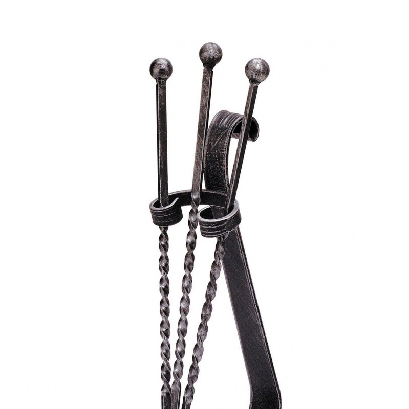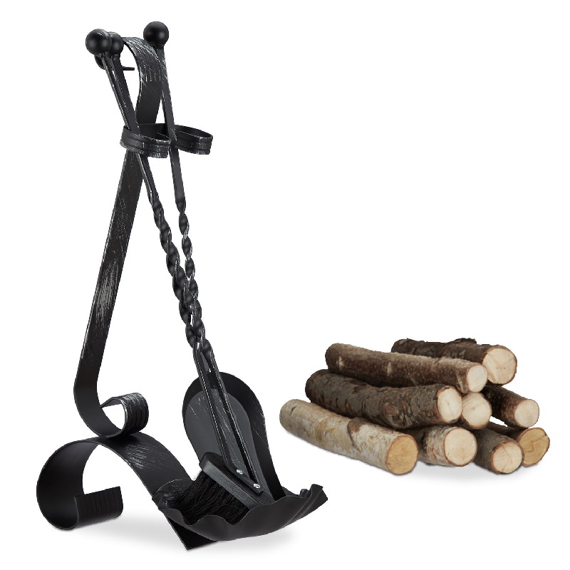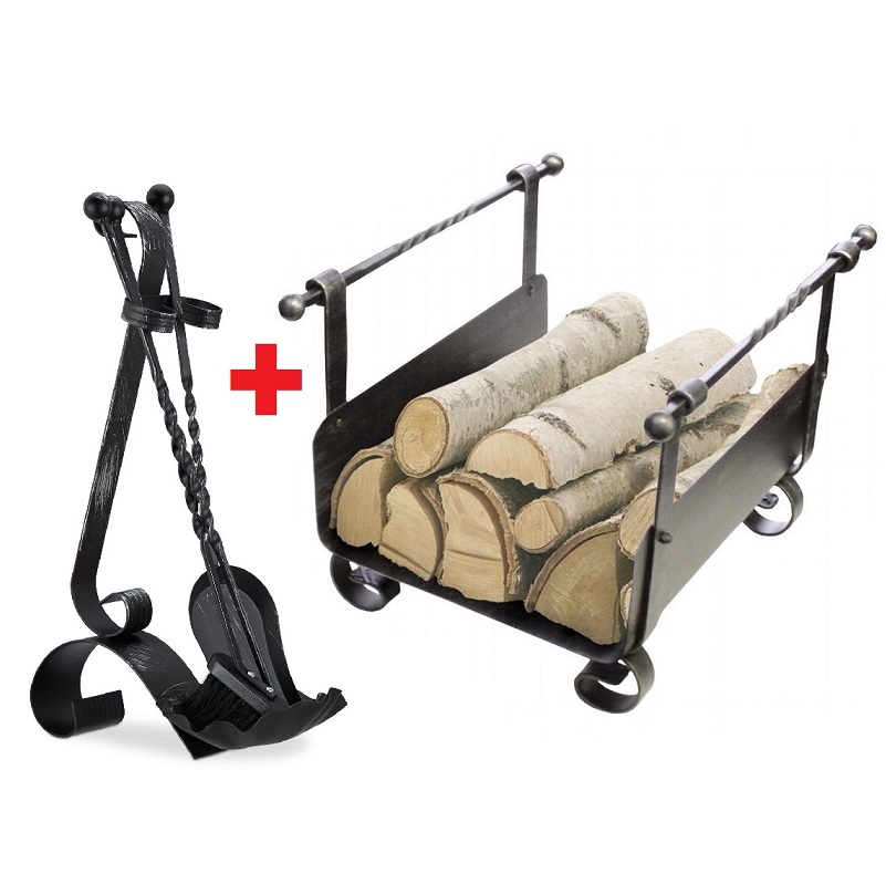 Set attrezzi 3+1 accompagnato da portalegna, il tutto realizzato in ferro stampato e verniciato nero con argento.