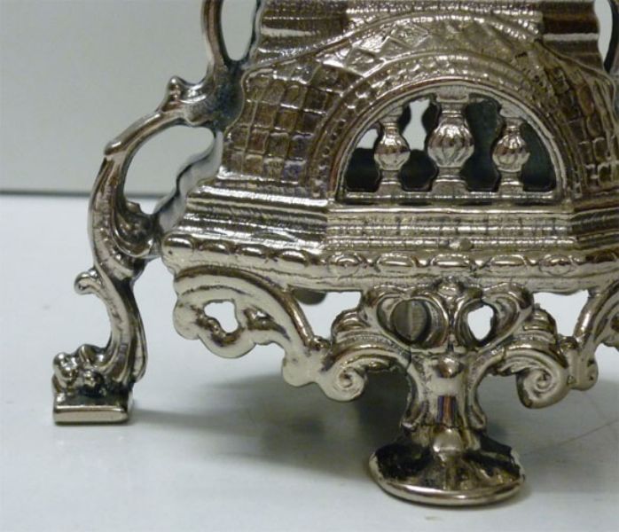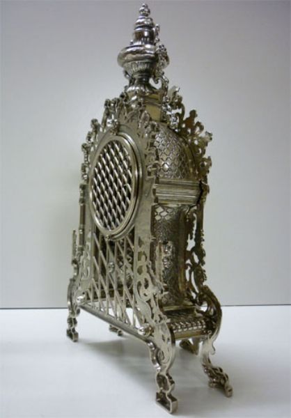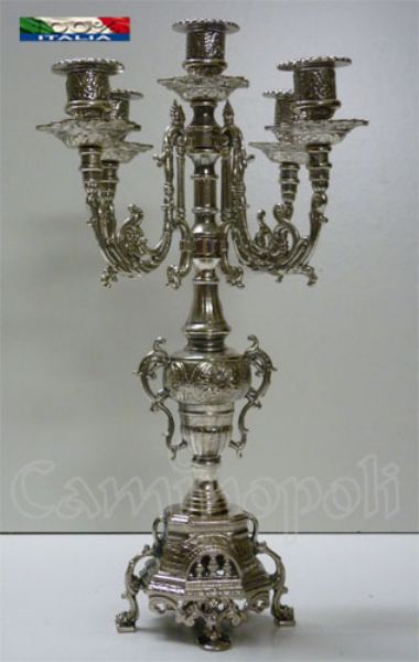 Trittico composto da orologio ed una coppia di candelieri, ogni candelabro ospita 5 candele ed insieme all’orologio che monte oggi movimento al quarzo sono rifiniti fronte/retro, questo significa che posti davanti ad una specchiera si esporranno nella loro massima bellezza, realizzati in massiccio bronzo e proposti in bagno galvanico d’Argento.