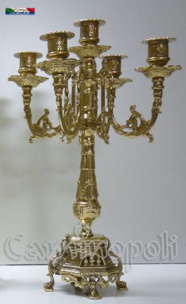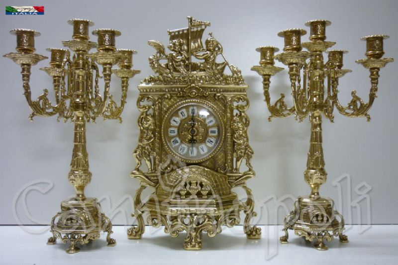 Trittico composto da orologio ed una coppia di candelieri, ogni candelabro ospita 5 candele ed insieme all’orologio che monte oggi movimento al quarzo sono rifiniti fronte/retro, questo significa che posti davanti ad una specchiera si esporranno nella loro massima bellezza, realizzati in massiccio bronzo e proposti nella finitura lucida.